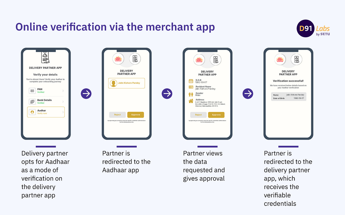 This verification mode redirects the user from the merchant app to the Aadhaar app. Let’s understand this through an example of a platform worker being verified by a delivery platform: