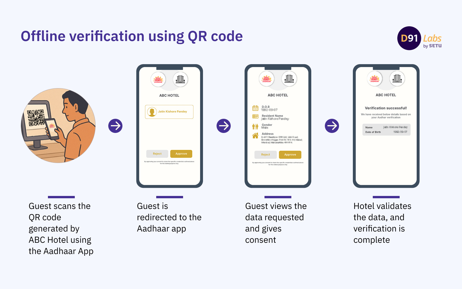 This is a key innovation of the app since it verifies credentials without real-time queries to UIDAI’s Central Identities Data Repository (CIDR). This reduces infrastructure load and limits data exposure. Here’s an illustration of the offline flow for a hotel check-in: