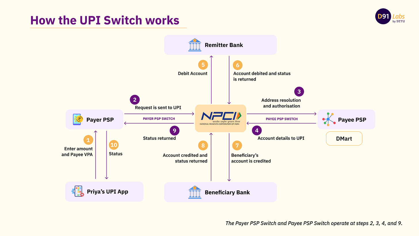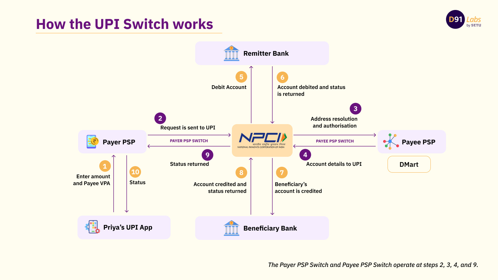 Imagine Priya is paying INR 1500 for groceries at DMart via UPI. This is how the transaction flow would look, with the UPI PSP switch working on the payer PSP and payee PSP’s end: